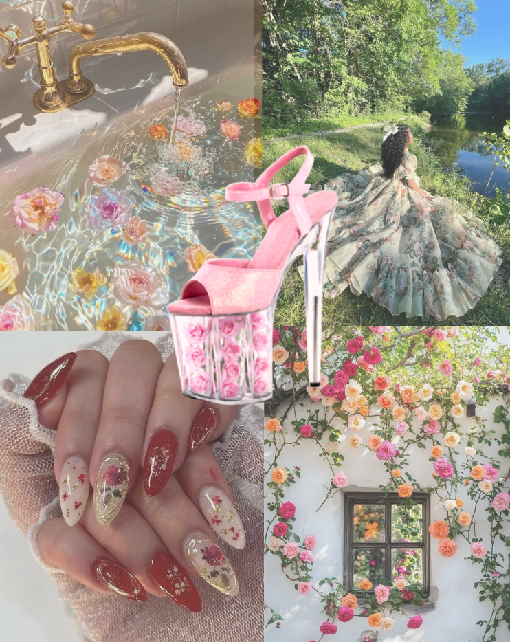 A collection of heels featuring delicate petals encased within the platform for a dreamy, feminine touch